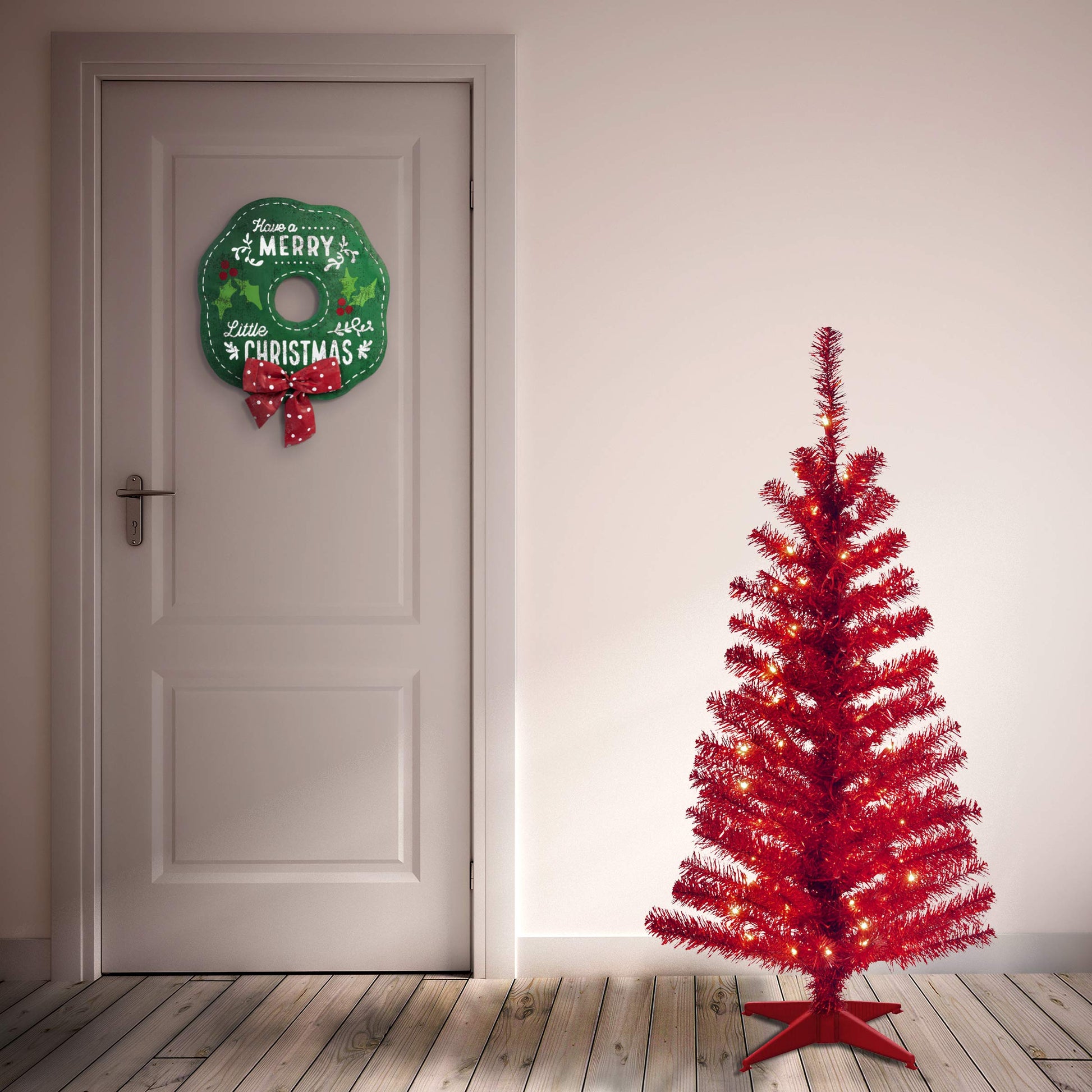 Transform your home into a winter wonderland with National Tree Company's Pre-Lit Artificial Christmas Tree. This Tinsel tree is 4 feet tall and has a 24 inch diameter base, creating a slimmer profile and making it a better option for those with limited space. Friends and family alike will marvel at how the tree closely mimics those outside. Made to look and feel lifelike, the stunning realism of the tree is defined by its close attention to detail, featuring hundreds of individually crafted branch tips that make up the wide, full-bodied branches that create space for your lights and ornaments. The tree is designed with a hinged branch system that allows the branches to swing down for a quick and simple set-up and fold back in for easy storage. Set aside 45-60 minutes after assembly to properly shape the tree by peeling back the branches and pulling the tips apart to give the branches a more full-bodied look. This fantastically festive tree is strung with 70 white UL lights prior to packaging and includes a sturdy, metal base for a more convenient setup. The lights operate individually, so if the bulb lens has not been cracked or broken, the light set will continue to illuminate except for any individual bulbs that are not working. Before dressing the tree in twinkling lights and glistening ornaments, consider placing it in a living room or dining area where it can be viewed from multiple angles and does not block any entryways. Constructed with sturdy, high quality materials and hypo-allergenic, fire-resistant needles, this tree is built to bring holiday cheer for years to come. At National Tree Company, we strive to create high quality Christmas decorations to help you transform your home so you can keep making every holiday moment magical.